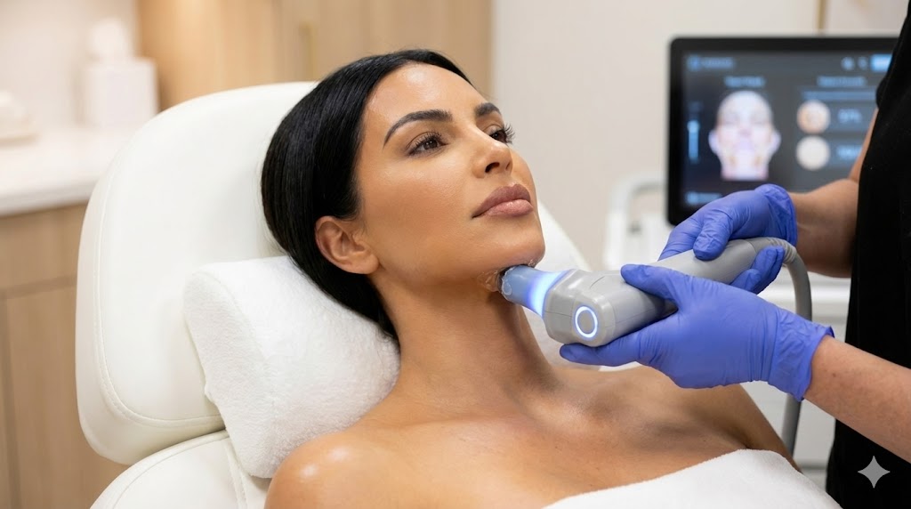 AI-guided fractional RF and targeted ultrasound for dermal enhancement.